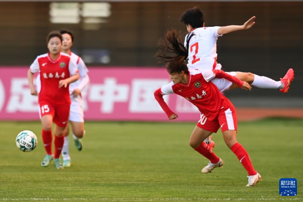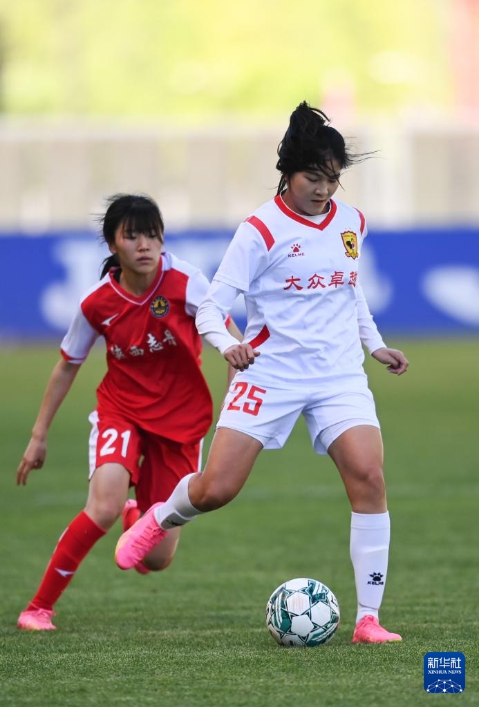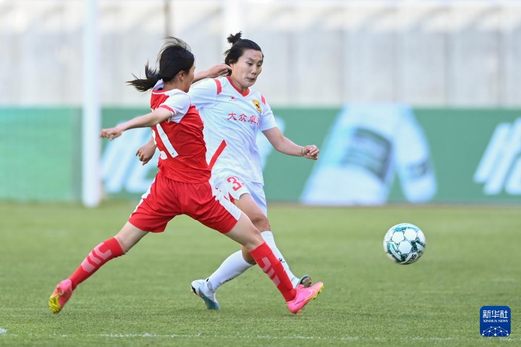 5月12日,長春大眾卓越隊球員郭楠(右)與陜西志丹隊球員楊靜在比賽中拼搶。新華社記者 鄒競一 攝