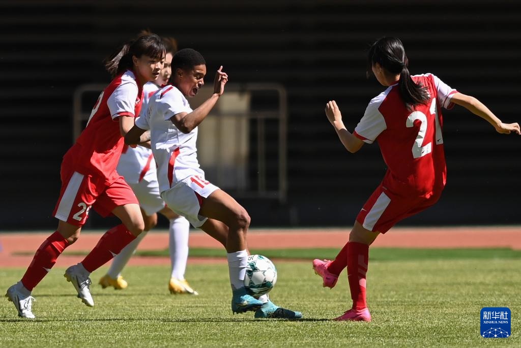 5月12日,陜西志丹隊球員楊靜(右一)與長春大眾卓越隊球員拉伊扎(右二)在比賽中拼搶。新華社記者 鄒競一 攝