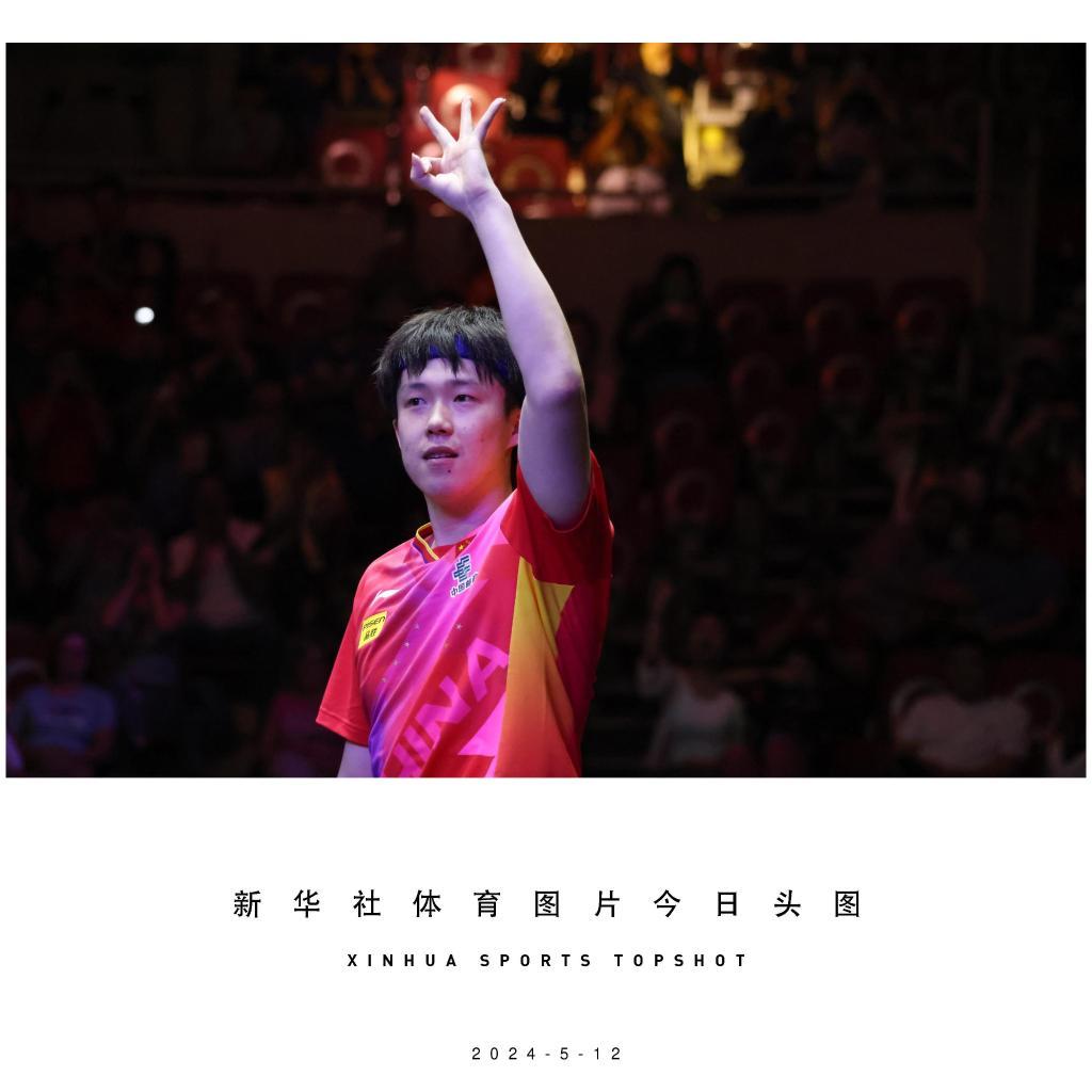 5月11日,王楚欽在奪冠后伸手比出“3”的手勢,慶祝收獲個人本屆賽事上的第三冠。新華社記者 王海洲 攝