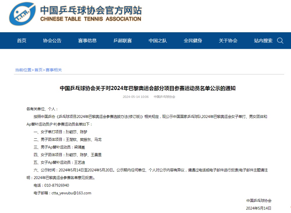 中國乒協(xié)此前已對巴黎奧運(yùn)會混雙、男單參賽運(yùn)動員名單進(jìn)行過公示?;祀p參賽運(yùn)動員為王楚欽/孫穎莎,男單參賽運(yùn)動員為王楚欽、樊振東。