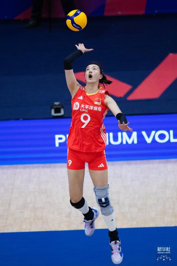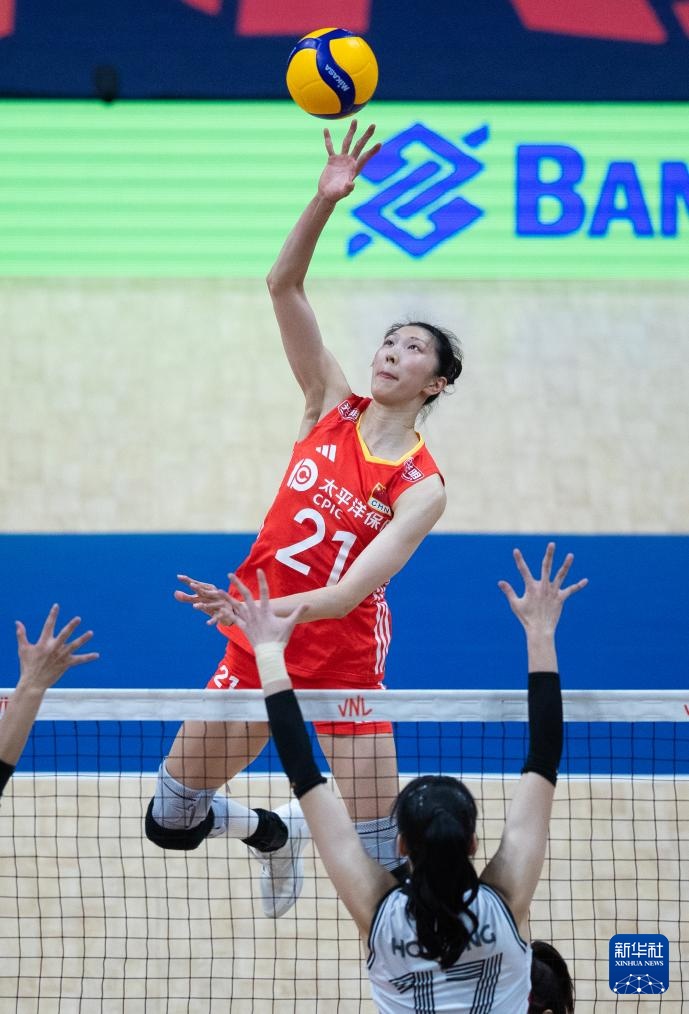 5月14日,中國隊球員吳夢潔(上)在比賽中扣球。新華社記者 王天聰 攝