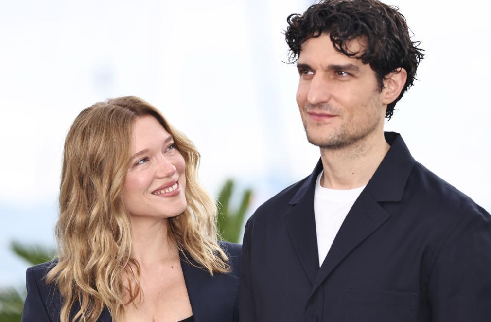 5月15日,在法國南部小城戛納舉行的第77屆戛納國際電影節上,開幕影片《第二幕》的主演、法國演員蕾雅·塞杜(左)和路易·加雷爾亮相拍照式。新華社記者 高靜 攝