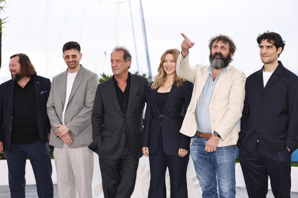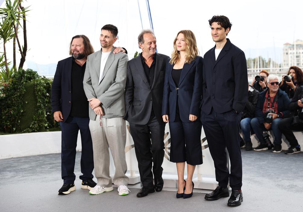 5月15日,在法國南部小城戛納舉行的第77屆戛納國際電影節上,開幕影片《第二幕》的導演康坦·迪皮厄(右二)攜主創人員亮相拍照式。新華社記者 高靜 攝