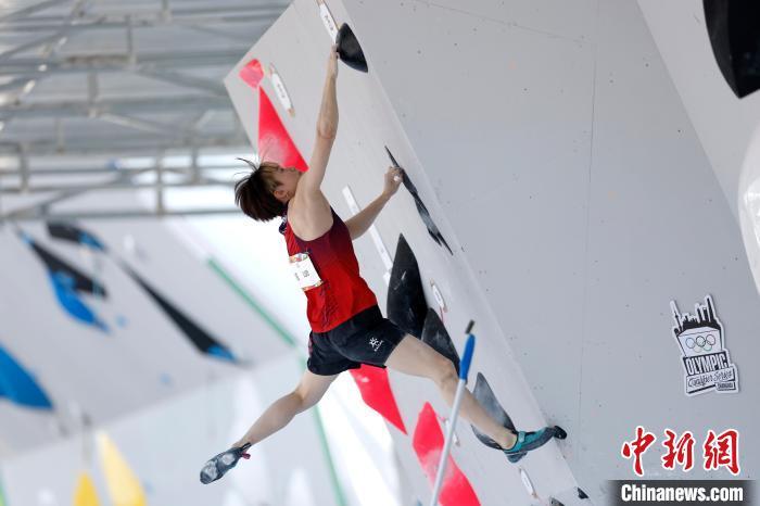 5月16日,中國選手駱知鷺亮相奧運會資格系列賽上海站女子攀巖全能預賽--攀石項目。 中新社記者 富田 攝