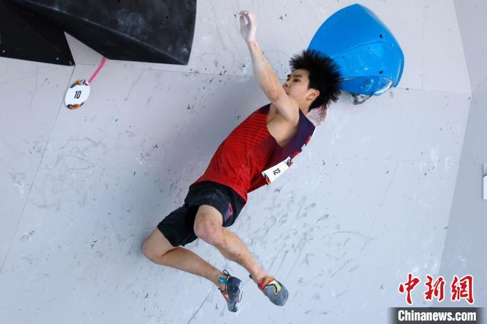 5月16日,中國選手潘愚非亮相奧運會資格系列賽上海站男子攀巖全能預賽--攀石項目。 中新社記者 富田 攝