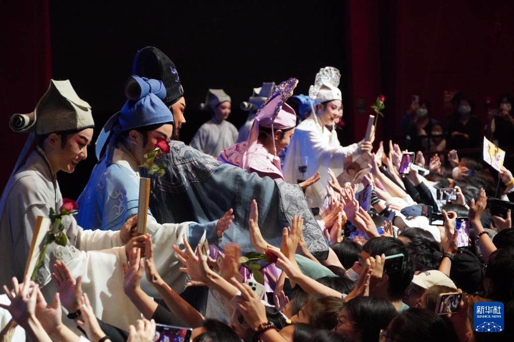 在杭州蝴蝶劇場,浙江小百花越劇院的演員在新版《梁祝》(青春版)演出后和觀眾互動(2023年10月25日攝)。新華社發(fā)(百越文化創(chuàng)意有限公司供圖)