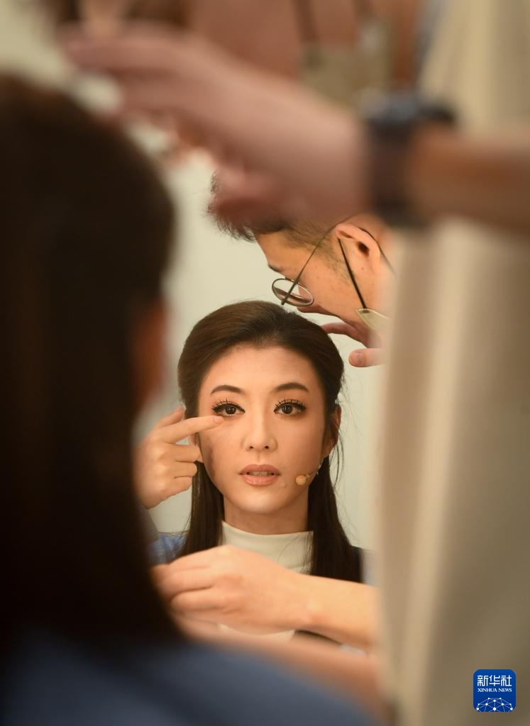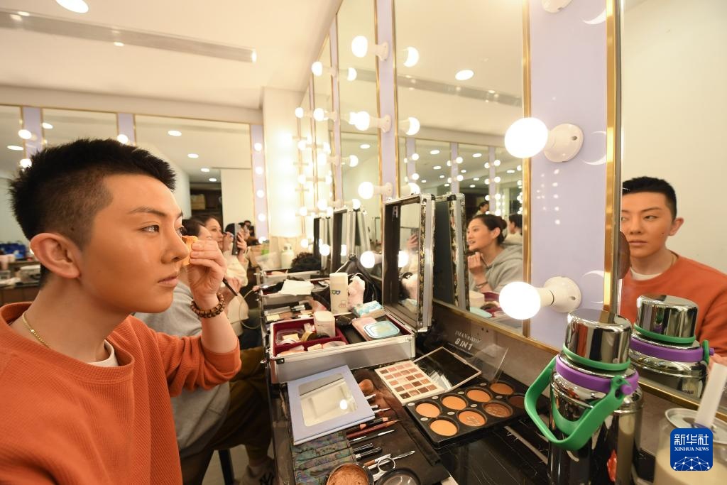 2024年5月1日,參演新編現(xiàn)代戲《錢塘里》的演員在杭州蝴蝶劇場的化妝間上妝。新華社記者 翁忻旸 攝
