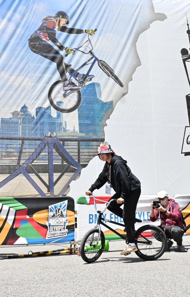 在16日的體驗環節前,鐘天使就搶先體驗了自由式小輪車項目,做出了幾個技術動作。雖然同屬自行車大項,小輪車和場地自行車的比賽用車還是有很大不同。她表示,在小輪車上完成這樣的動作,確實是全新的體驗。