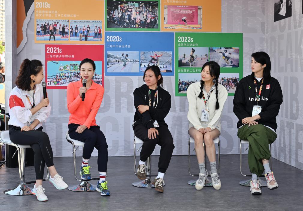 5月16日,嘉賓吳敏霞(左二)、鐘天使(中)、黃齡(右二)、趙麗娜(右一)參加訪談活動。新華社記者 陶希夷 攝