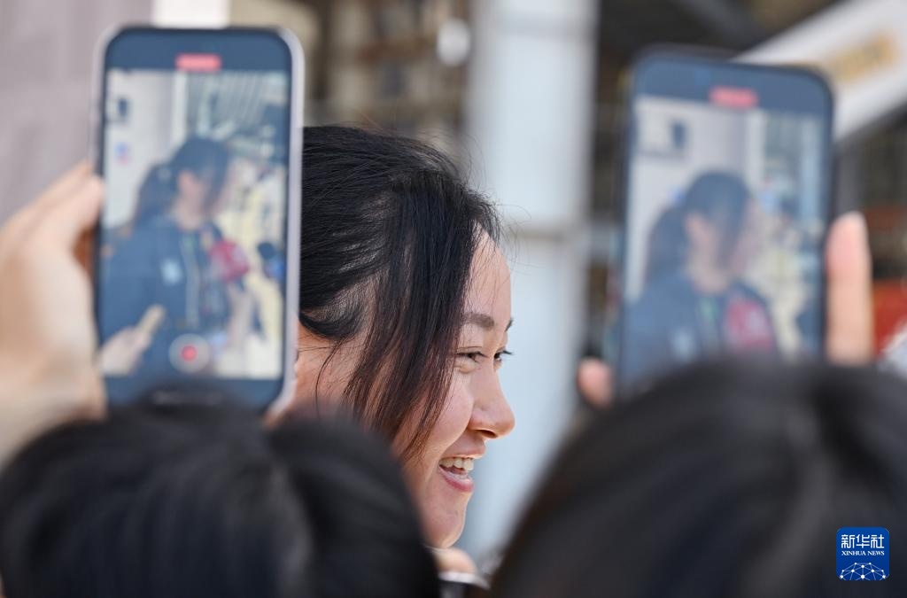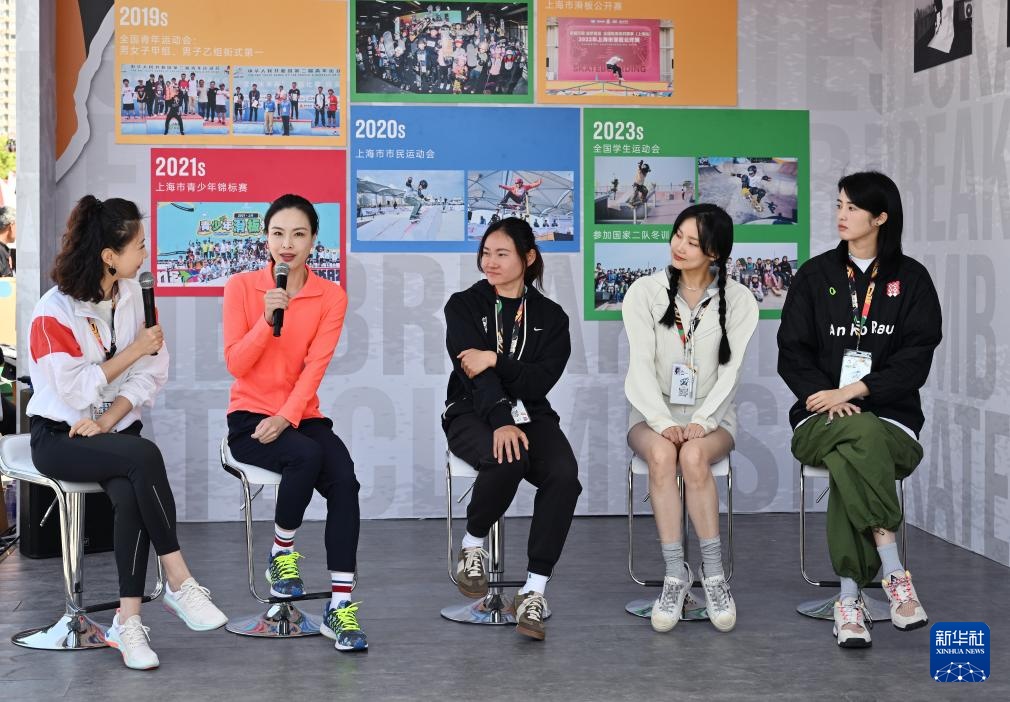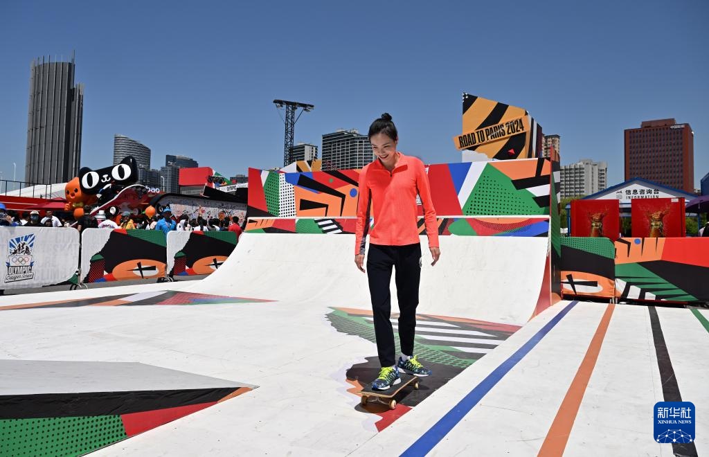 5月16日,吳敏霞在活動中體驗滑板。新華社記者 陶希夷 攝