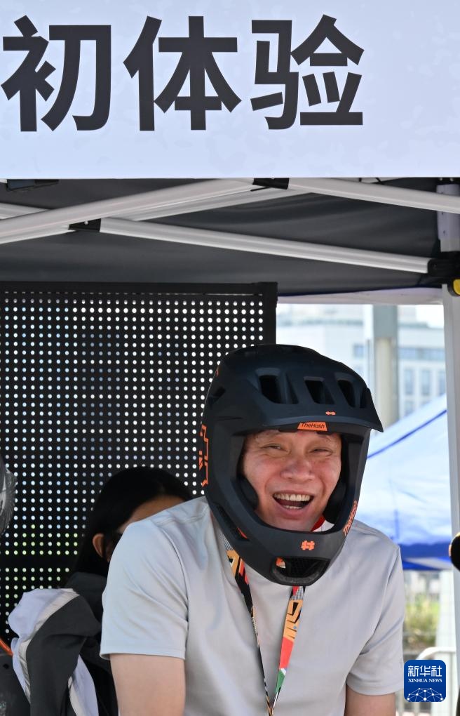 5月16日,范志毅在活動中體驗小輪車。新華社記者 陶希夷 攝