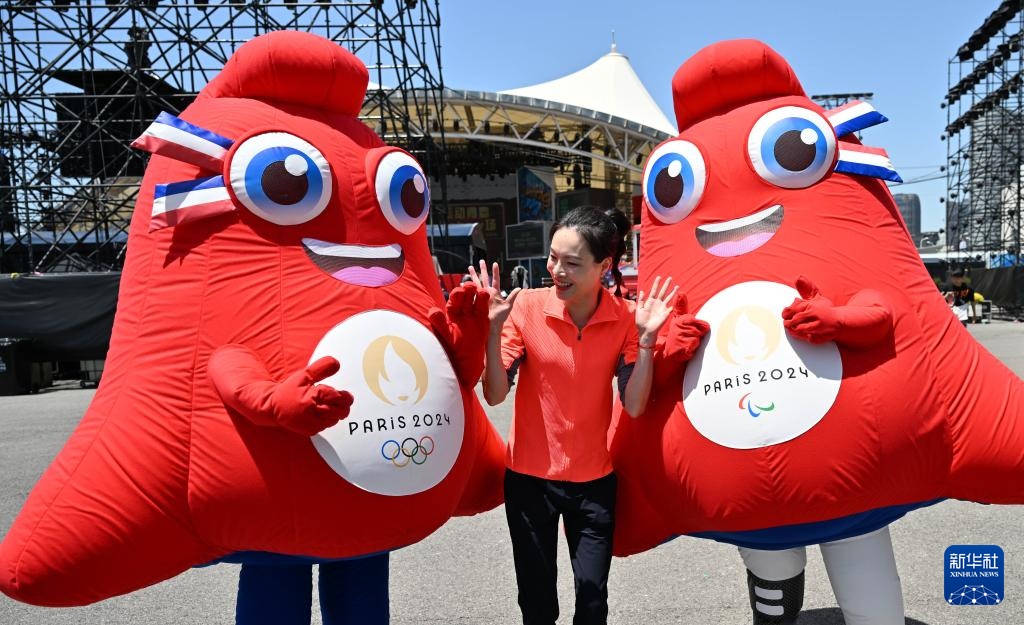 5月16日,吳敏霞與巴黎奧運會、巴黎殘奧會吉祥物合影。新華社記者 陶希夷 攝