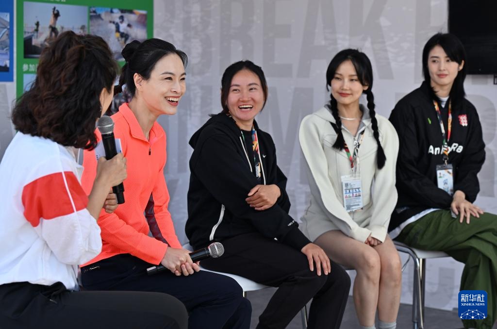 5月16日,嘉賓吳敏霞(左二)、鐘天使(中)、黃齡(右二)、趙麗娜(右一)參加訪談活動。新華社記者 陶希夷 攝