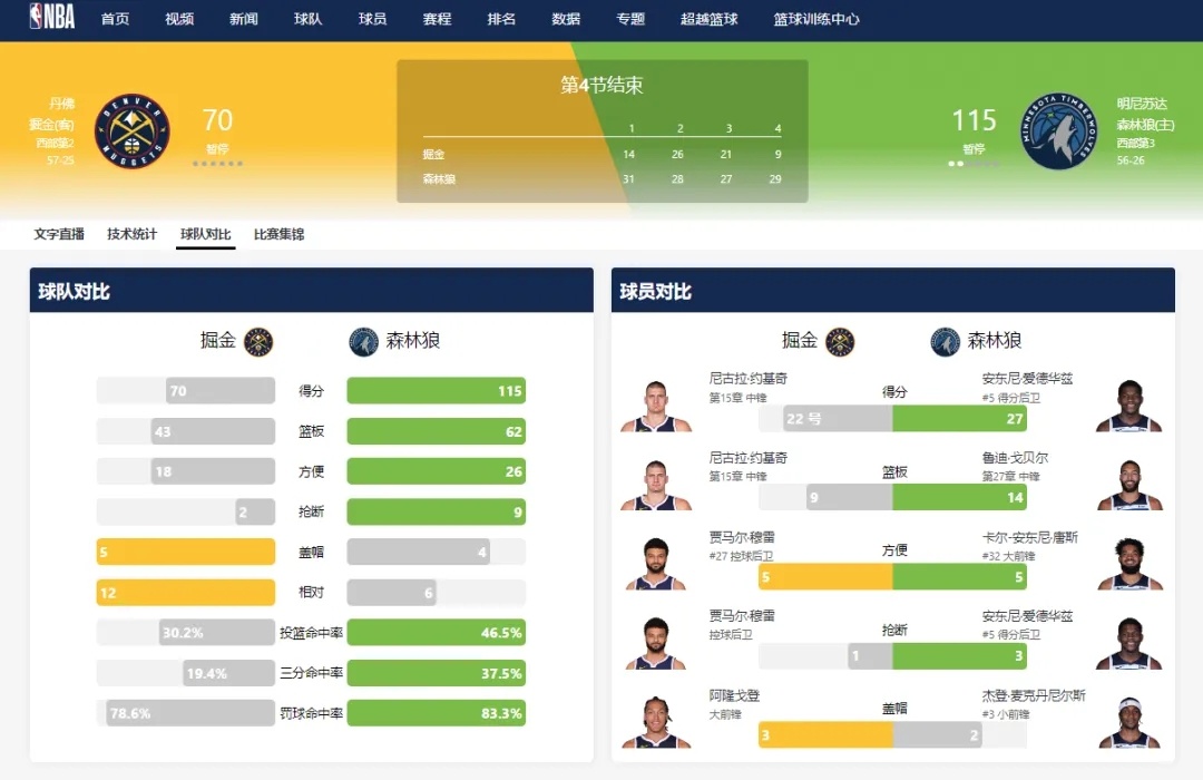 本輪系列賽頗具戲劇性,森林狼隊(duì)在當(dāng)家球星愛德華茲的率領(lǐng)下一度總比分2:0領(lǐng)先。此后,掘金隊(duì)突然覺醒,約基奇、穆雷、戈登等人發(fā)揮出色,衛(wèi)冕冠軍連贏三場(chǎng)拿到系列賽賽點(diǎn)。