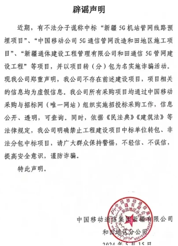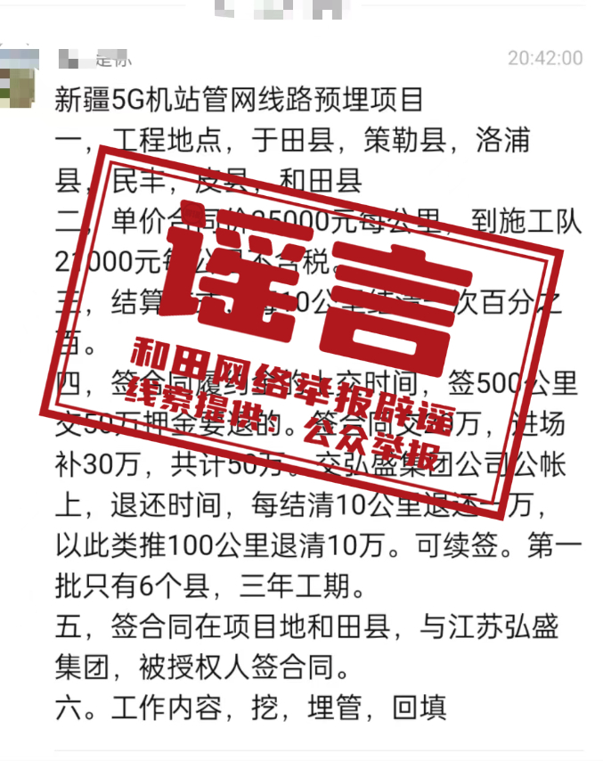 近期,個別網民謊稱中標“新疆5G機站管網線路預埋項目”“中國移動公司5G通信管網改造和田地區(qū)施工項目”“新疆通體建設工程管理有限公司和田通信5G管網建設工程”等項目,并以項目轉(分)包為名實施詐騙活動。