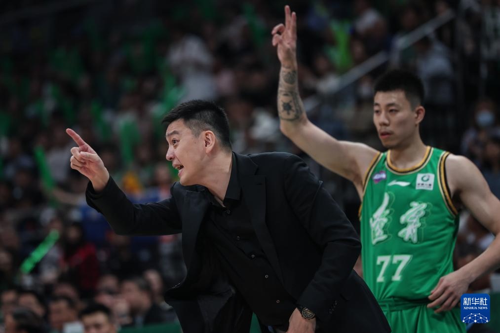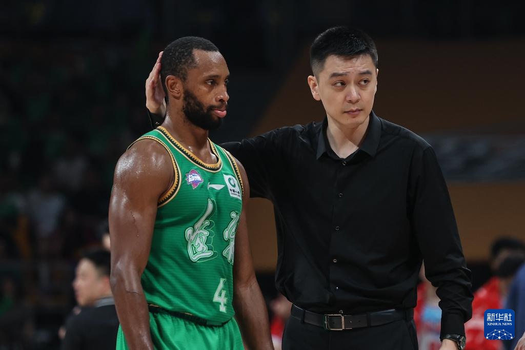 5月17日,遼寧本鋼隊主教練楊鳴(右)在比賽中鼓勵球員弗格。