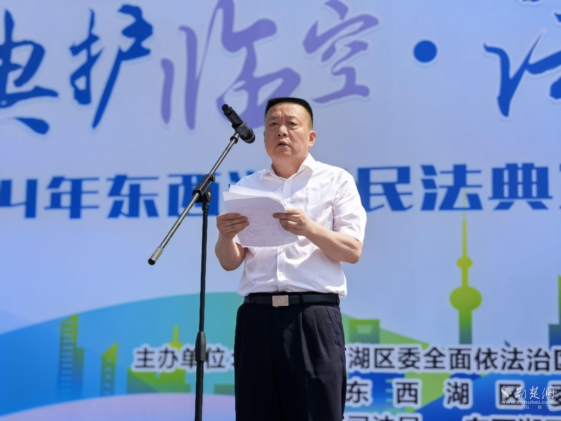 劉新濤在致辭中表示,希望全市各單位持續深入推進民法典學習宣傳教育、全面加大優化營商環境專項普法、持續辦好法治惠民惠企實事。希望東西湖區在提升普法針對性、實效性上,積極探索、開拓創新,在法治惠民惠企實事上更多體現東西湖特色、突出東西湖亮點,為全市打造更優的法治建設品牌提供東西湖經驗、貢獻東西湖智慧。