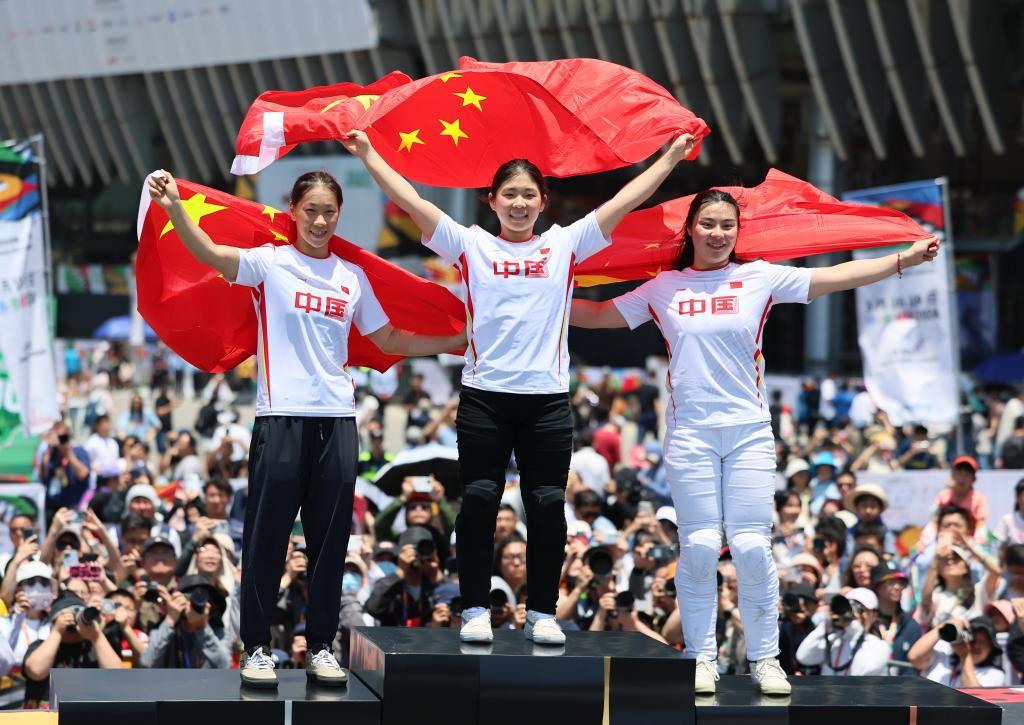 5月18日,亞軍孫佳琪(左)、冠軍孫思蓓(中)、季軍鄧雅文在頒獎儀式上慶祝。新華社記者 王楷焱 攝