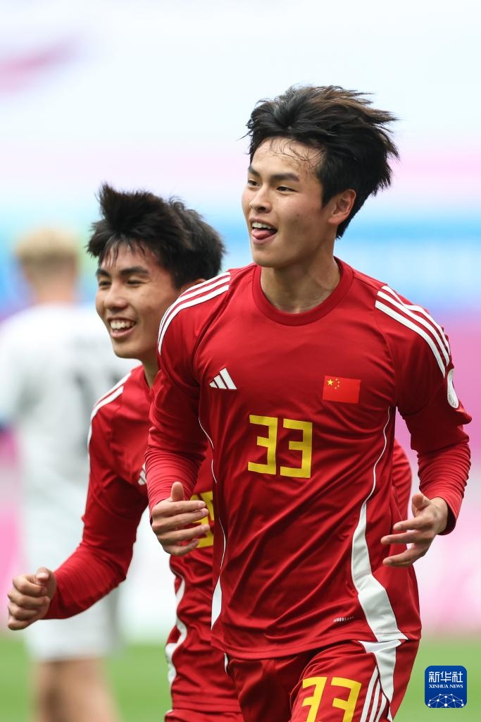5月18日,中國中學生男子足球三隊球員鄧捷夫(右)進球后慶祝。新華社記者 潘昱龍 攝
