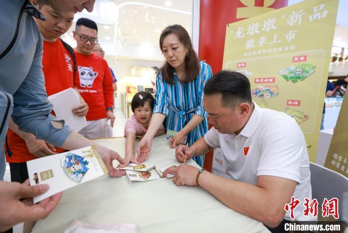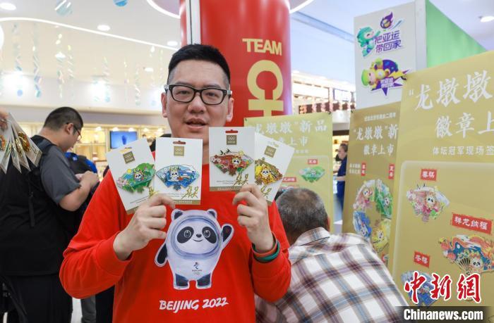 中新網北京5月19日電 (記者 賈天勇)18日,名為“春祺”、“夏安”、“秋綏”、“冬禧”和“祥龍納福”的五款龍墩墩主題系列徽章在北京王府井工美大廈上市銷售。發售現場,中國花樣滑冰世界冠軍張昊到場為市民和收藏愛好者進行龍墩墩徽章首日發售的簽售活動,現場氣氛熱烈。