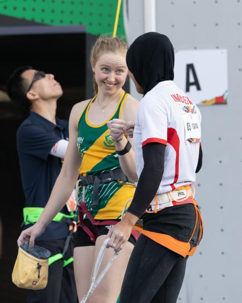 在成為攀巖運動員之前,奧茨練了十年的芭蕾舞。一次排練途中,她路過一家攀巖館,里面正在舉辦一場練習賽。她好奇地進去圍觀,隨之被巖友之間相互鼓勵的氛圍感染,當年年底便正式轉向了攀巖。2020年,她開始出現(xiàn)在國際賽場上,目前是非洲女子速度攀巖紀錄的保持者。不過,由于南非攀巖項目發(fā)展水平有限,她不得不獨自全球旅行,尋找高水平教練、場地,以及賽事。