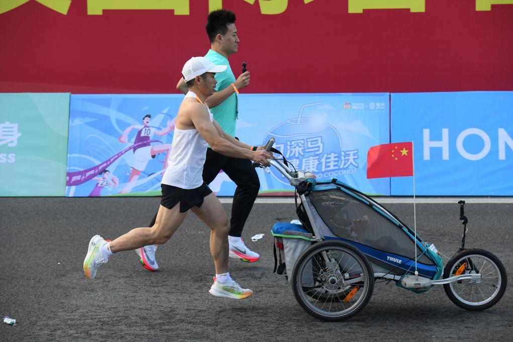 2023年2月19日,羅書堅推著兒子在深圳馬拉松比賽中奔跑。新華社記者 梁旭 攝