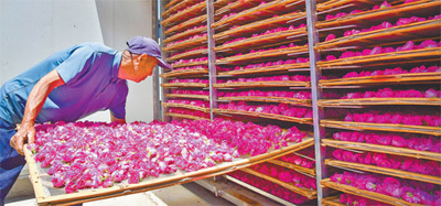 圖為平陰縣玫瑰鎮花農在加工玫瑰花。