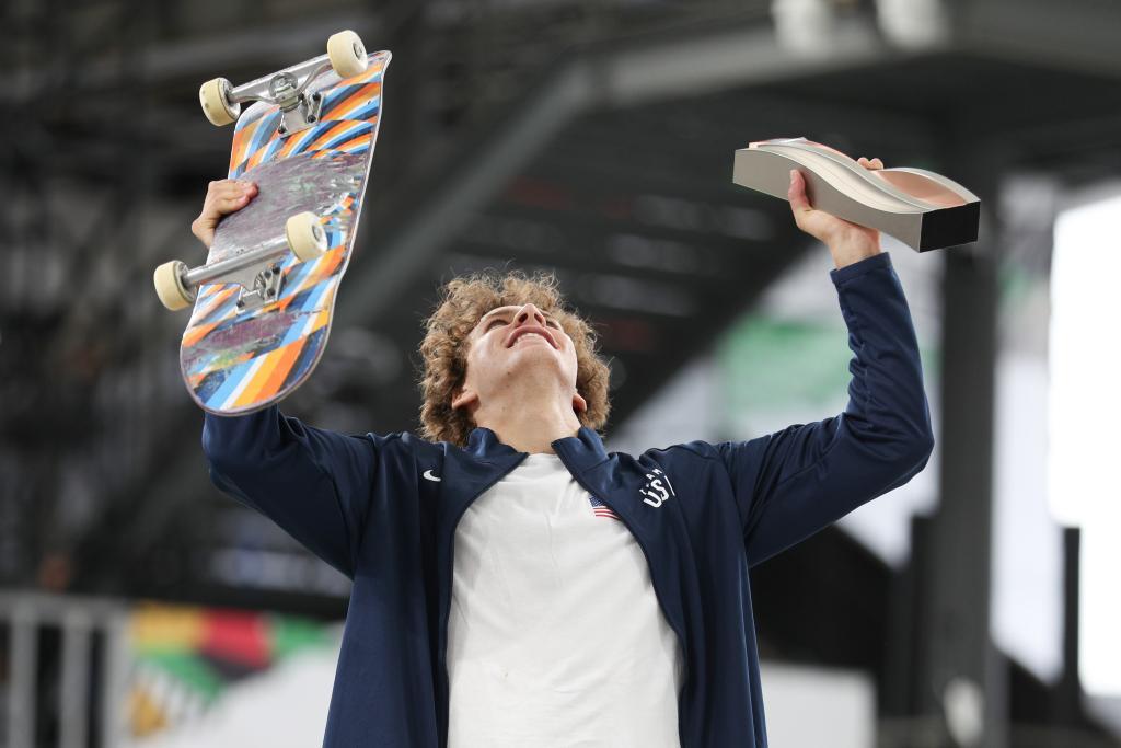 5月19日,美國選手賈格爾·伊頓在男子碗池頒獎儀式上慶祝。新華社記者 許雅楠 攝