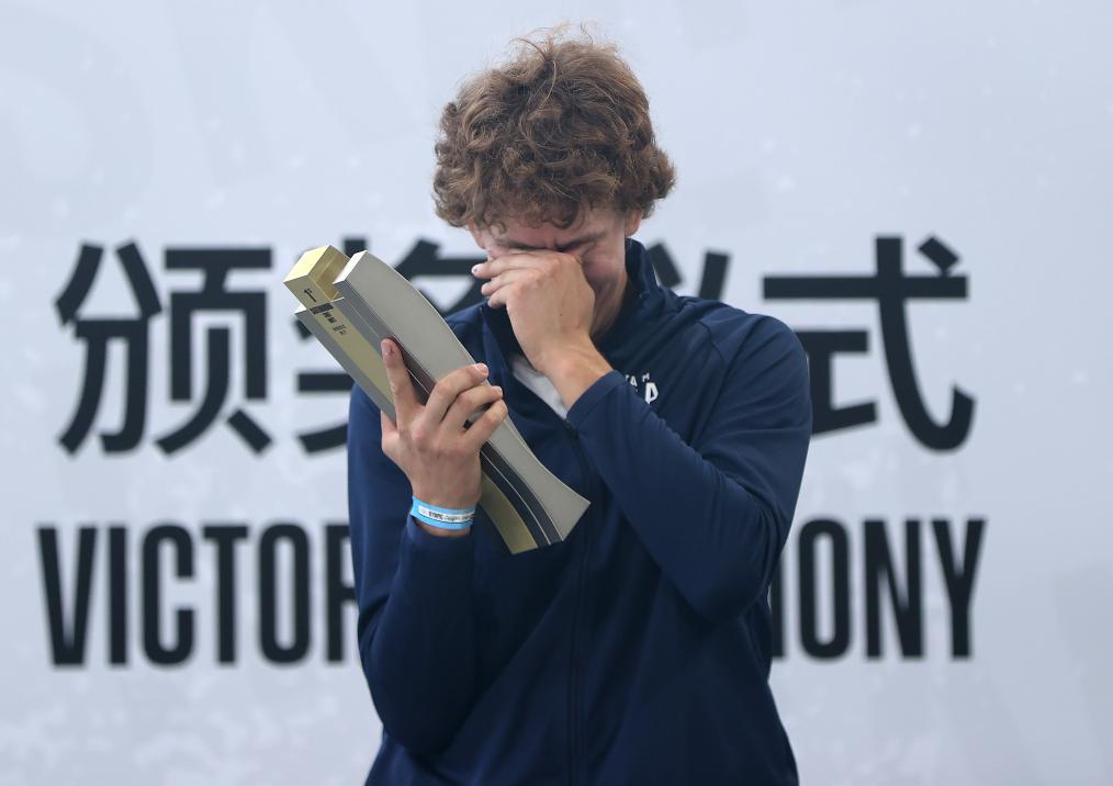 5月19日,美國選手賈格爾·伊頓在頒獎儀式上落淚。新華社記者 賈浩成 攝