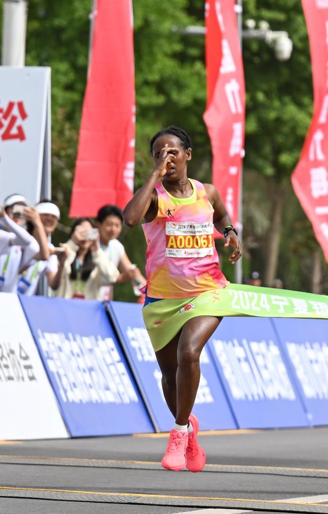 5月19日,埃塞俄比亞選手切克勒·塞達爾在比賽中沖過終點。新華社記者 馮開華 攝