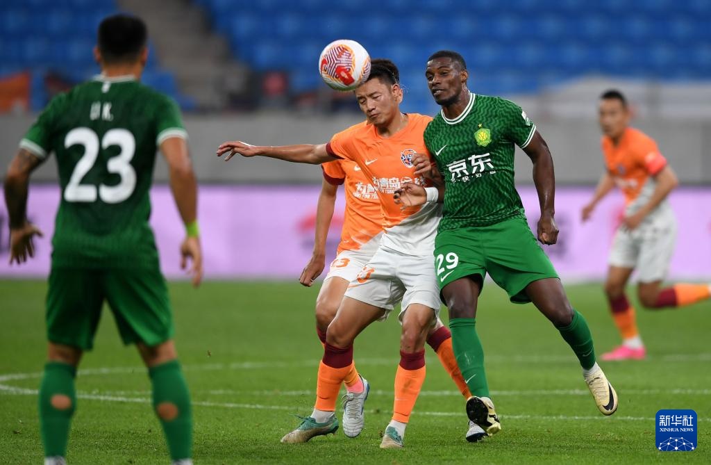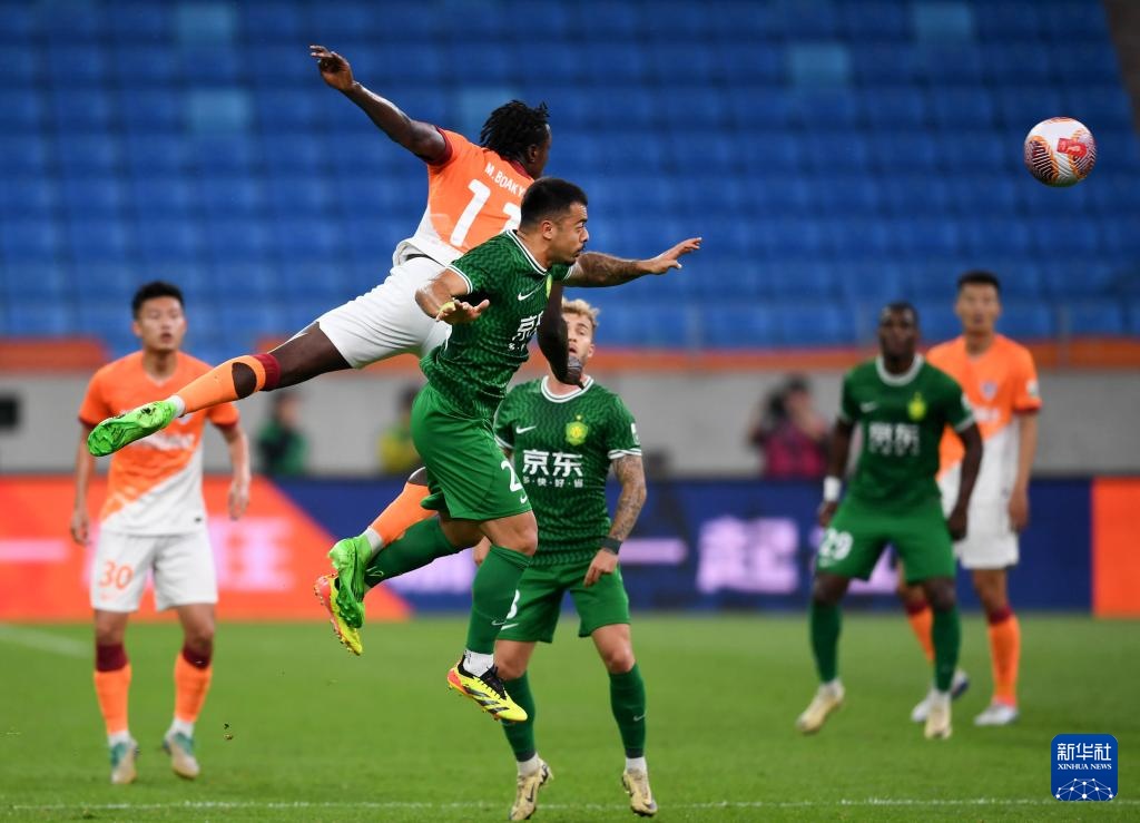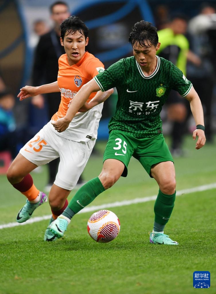 5月21日,青島海牛隊球員王建明(左)在比賽中與北京國安隊球員江文豪拼搶。新華社記者 李紫恒 攝