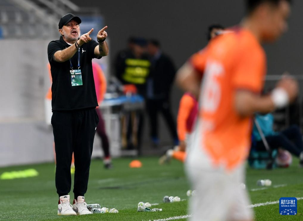 5月21日,青島海牛隊主教練亞森在場邊指導。新華社記者 李紫恒 攝