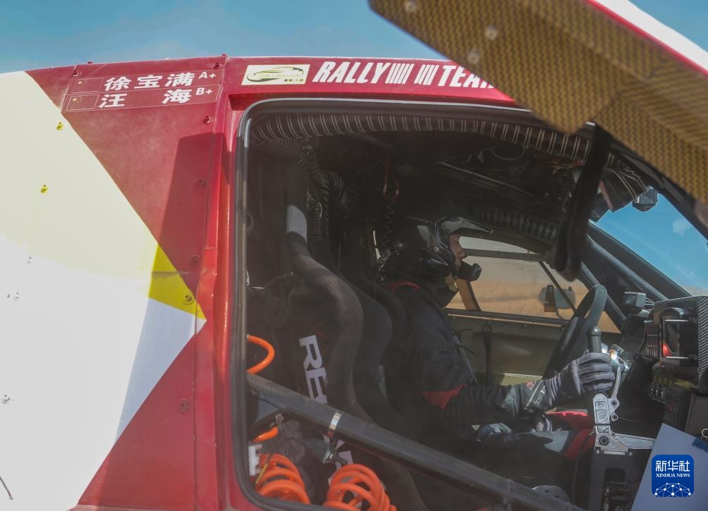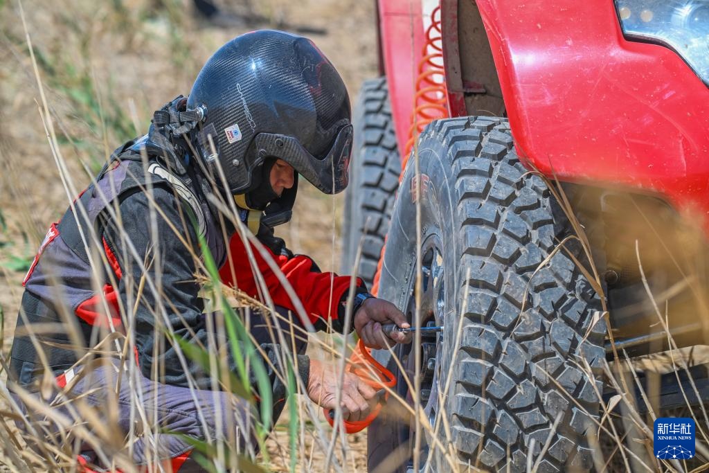 5月21日,黑龍江龍嘉先越拉力藝車隊車手汪海在檢查車輛故障。新華社記者 陳朔 攝