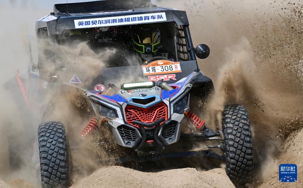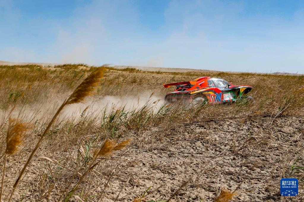 5月21日,英國貝爾潤滑油極道體育車隊車手王慶喜、領航員郭峰駕駛車輛在比賽中(無人機照片)。新華社記者 張嘯誠 攝