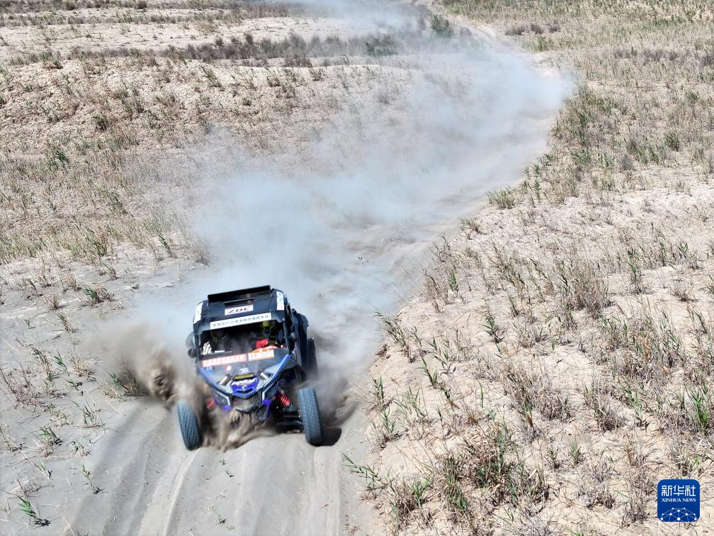 5月21日,承德雷鋒松坡小鳳仙酒店車隊車手吳琦會、領航員張露駕駛車輛在比賽中(無人機照片)。新華社記者 張嘯誠 攝