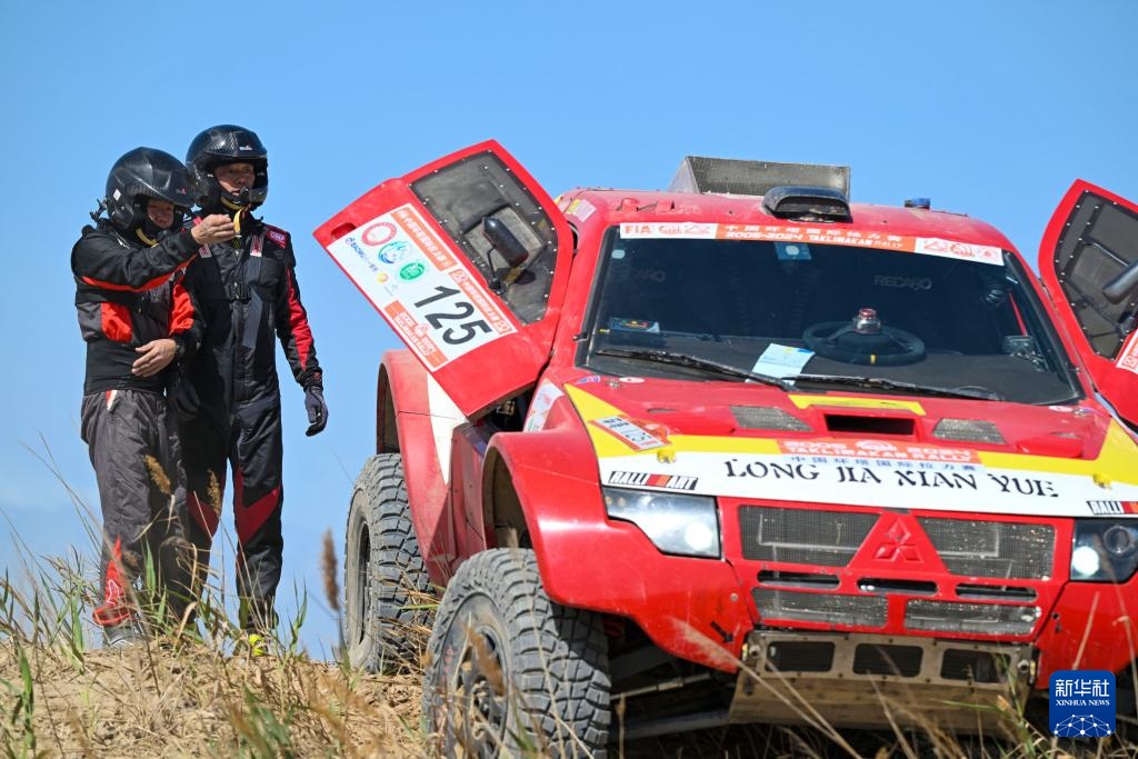 5月21日,黑龍江龍嘉先越拉力藝車隊車手汪海(右)、領航員徐寶滿車輛發生故障。新華社記者 陳朔 攝