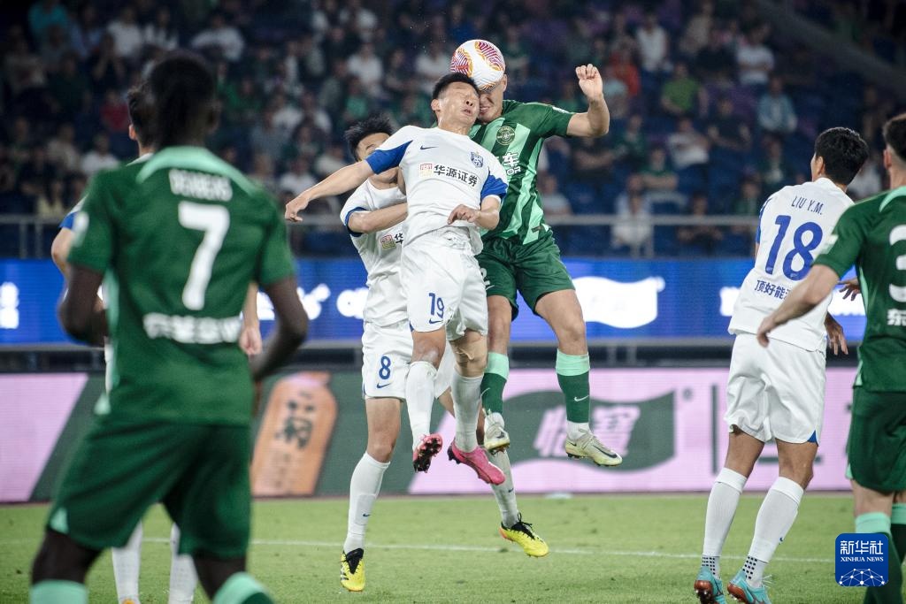 5月21日,浙江隊球員梁諾恒(上右)在比賽中與武漢三鎮隊球員劉越(上中)爭頂。新華社記者 江漢 攝