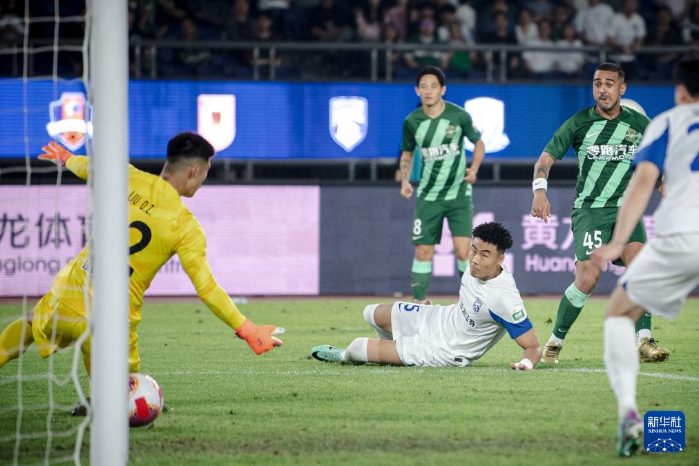 5月21日,浙江隊球員萊昂納多(右一)在比賽中射門得分。新華社記者 江漢 攝