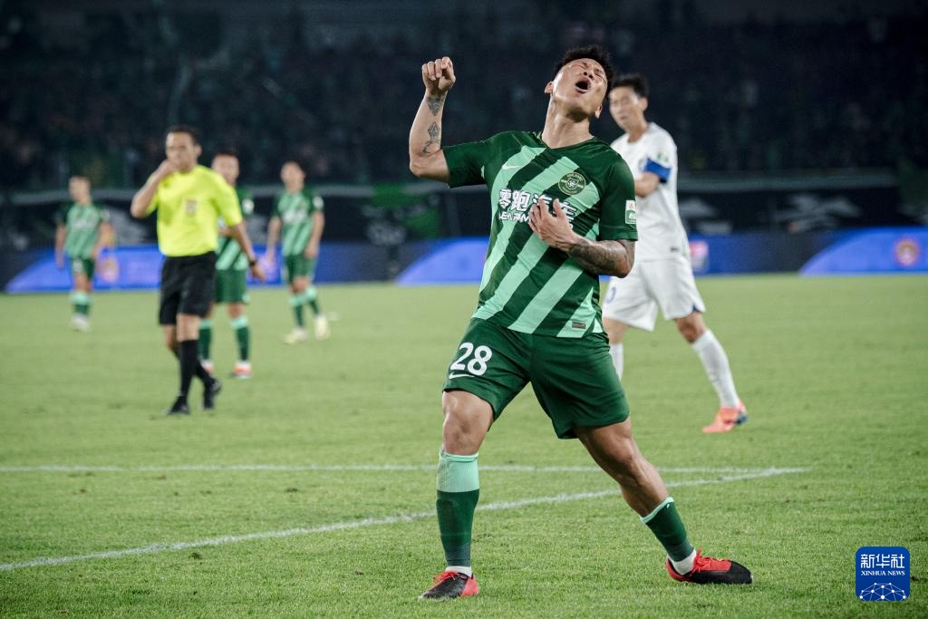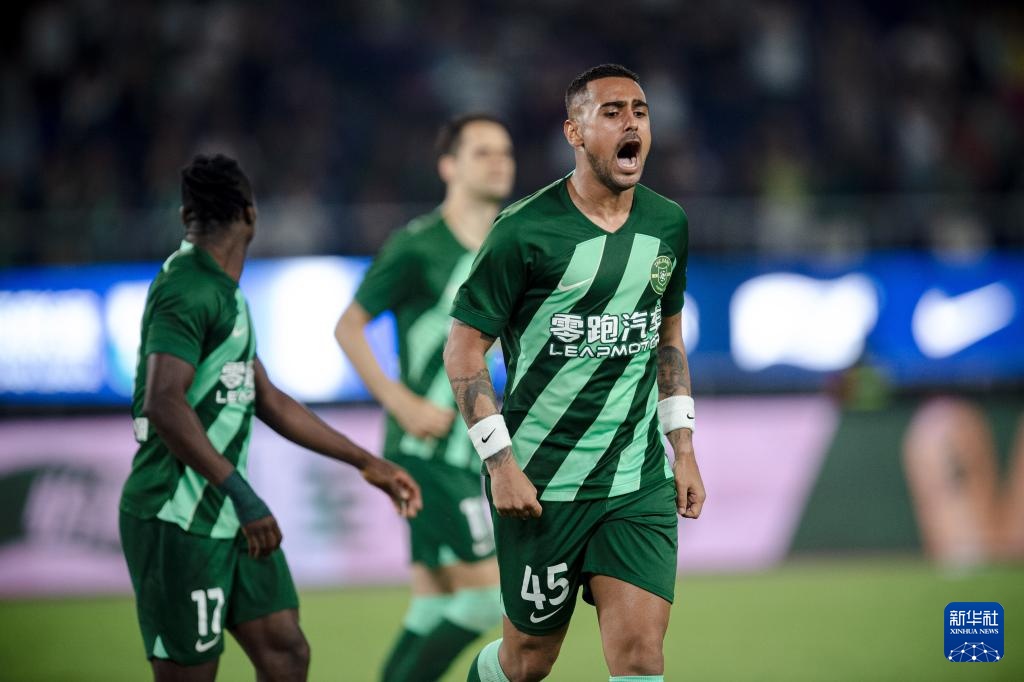 5月21日,浙江隊球員萊昂納多(前)在比賽中慶祝進球。新華社記者 江漢 攝
