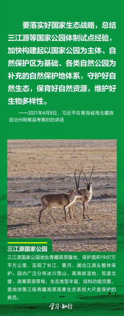 “生物多樣性使地球充滿生機,也是人類生存和發展的基礎。”推進以國家公園為主體的自然保護地體系建設,是習近平總書記作出的重要部署。三江源、大熊貓、東北虎豹、海南熱帶雨林、武夷山等首批國家公園正式設立以來,生態功能持續向好,對保護生物多樣性、推進人與自然和諧共生的現代化具有重要意義。