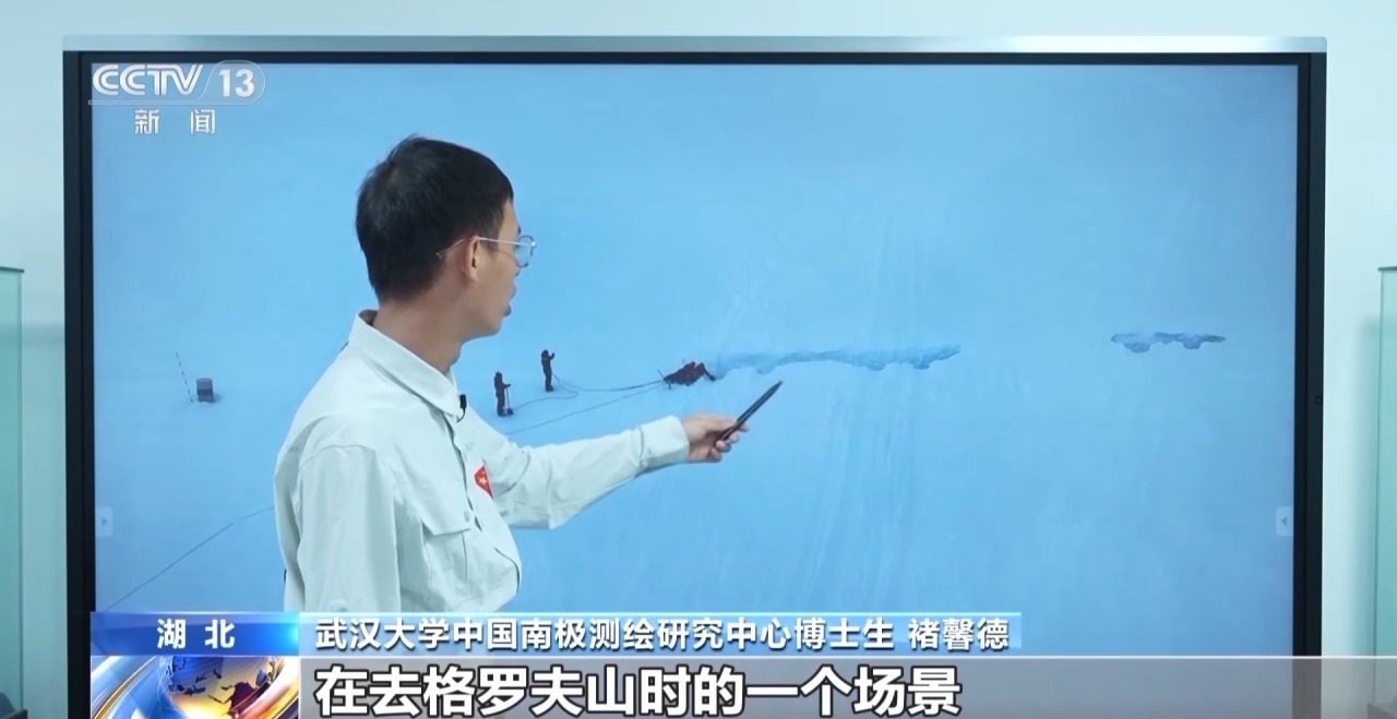 武漢大學(xué)中國(guó)南極測(cè)繪研究中心博士生 褚馨德:這是我們當(dāng)時(shí)在去格羅夫山時(shí)的一個(gè)場(chǎng)景。有些冰裂隙的區(qū)域,它其實(shí)是被積雪覆蓋的,就是人的肉眼是無法看到的,那么這個(gè)時(shí)候,人員在冰裂隙附近作業(yè)的話會(huì)比較危險(xiǎn)。