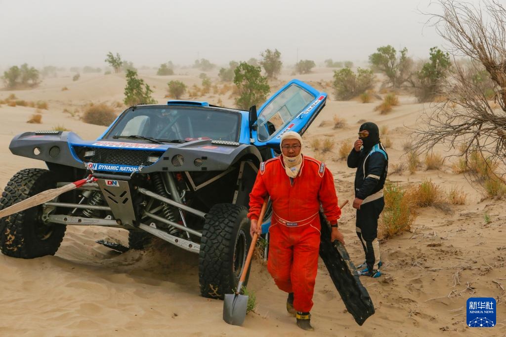 5月23日,唐山漫途游改裝多耐減震器車隊車手李長彬、領航員馮從彪在比賽中陷車,馮從彪(左)從車中取用工具。新華社記者 陳朔 攝