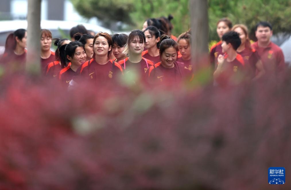 5月23日,中國女足隊員抵達訓練場。新華社記者 賈浩成 攝
