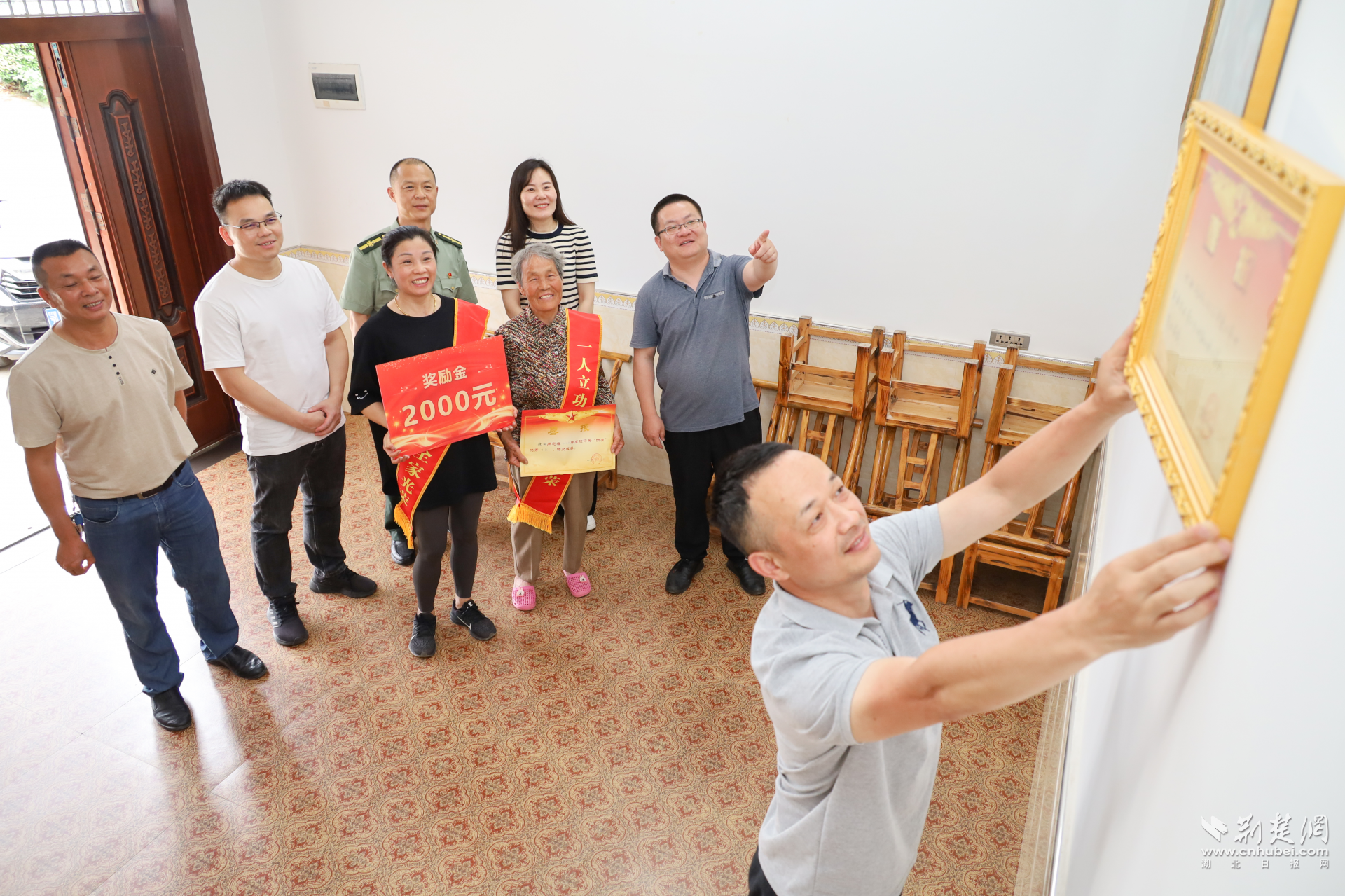 “你們可以幫我們把三等功喜報掛在墻上嗎?”現(xiàn)役軍人倪棚的奶奶說道。5月22日上午10時,江夏區(qū)金口街南岸三村裕民灣的現(xiàn)役軍人倪棚家里一片忙碌,工作人員正在給家屬拉橫幅、掛綬帶、送慰問金和掛喜報相框……