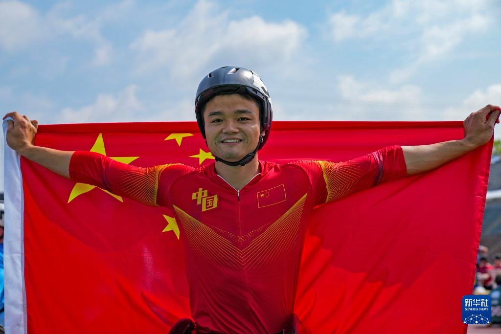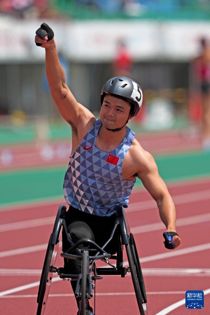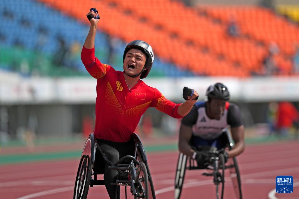 5月24日,中國選手胡洋在男子100米T54級別決賽后慶祝,最終他以13秒95的成績獲得亞軍。新華社記者 張笑宇 攝