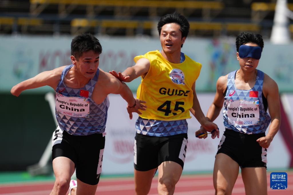 5月24日,中國隊第一棒選手周國華(右)和他的引導員賈登璞(中)與第二棒選手王浩在4X100米混合接力預賽中接力。最終中國隊以45秒66的成績晉級決賽。新華社記者 張笑宇 攝