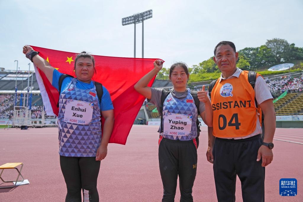 5月24日,教練李秀清(右)同中國選手趙玉萍(中)、薛恩慧在女子鉛球F12級別決賽后合影。趙玉萍以12米71的成績獲得亞軍,薛恩慧以11米00的成績獲得季軍。新華社記者 張笑宇 攝
