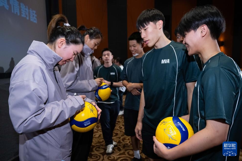 5月24日,中國女排隊員倪非凡(左一)、龔翔宇(左二)與青少年球員簽名。新華社記者 張金加 攝