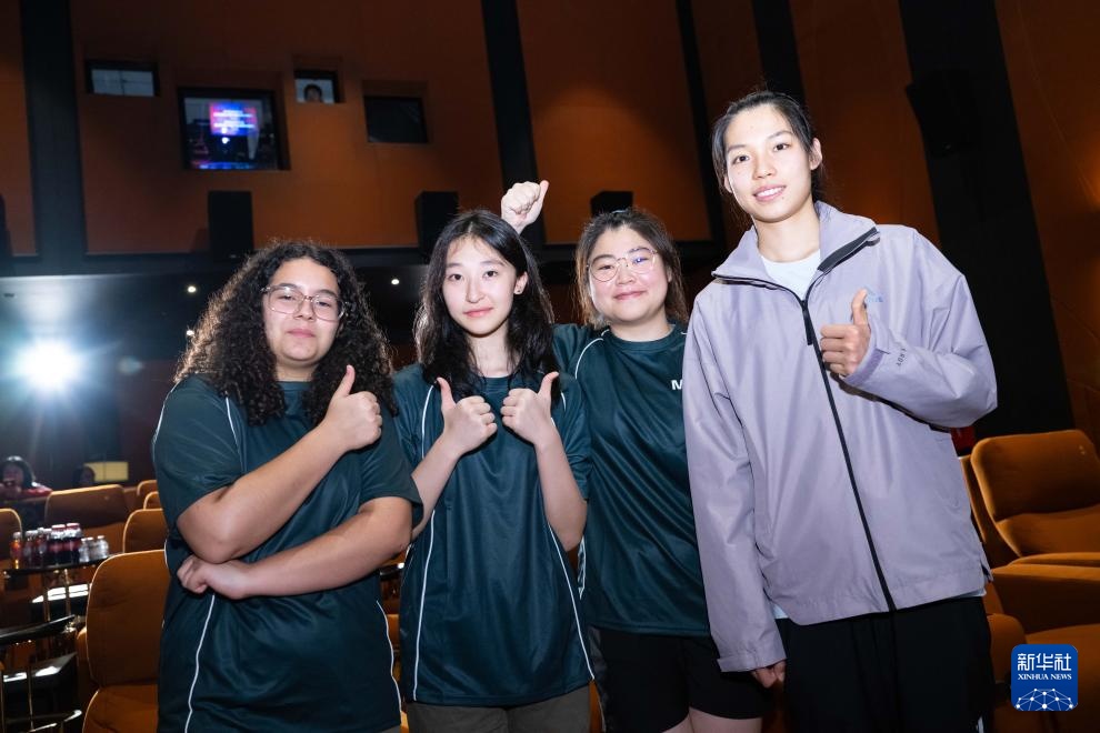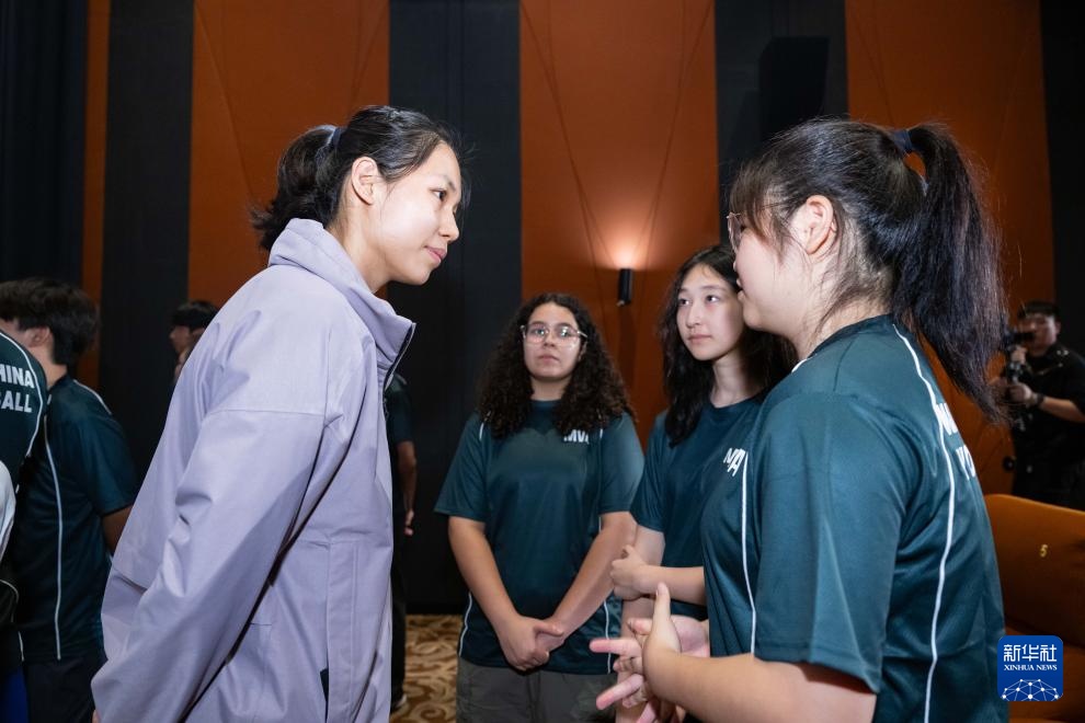 5月24日,中國女排隊員莊宇珊(左一)與青少年球員交流。新華社記者 張金加 攝