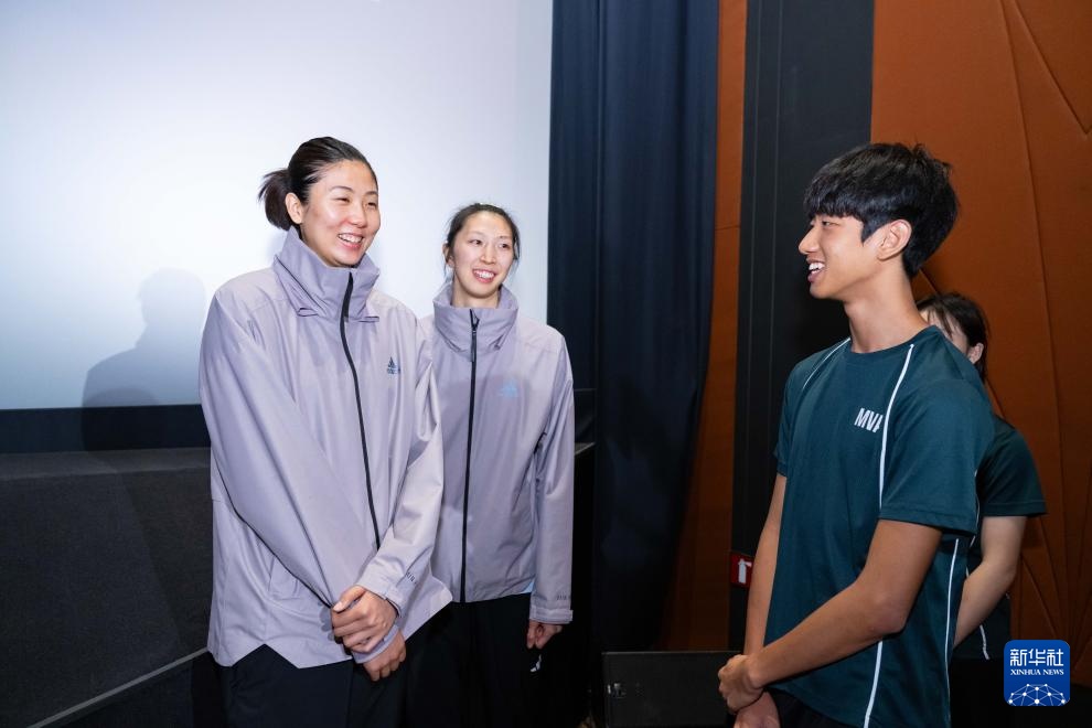 5月24日,中國女排隊員高意(左)、吳夢潔(中)與青少年球員交流。新華社記者 張金加 攝
